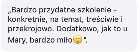 "W świecie gwiazdorstwa i lansowania siebie Mary świeci zupełnie innym blaskiem. To blask, który kieruje na potrzeby i stronę klienta. W trakcie sesji czułam się widziana, moje zdanie i potrzeby wzięte pod uwagę oraz uwzględnione w propozycjach zmian. Tak to powinno wyglądać. Chętnie wrócę przy kolejnych sprawach i polecę dalej."